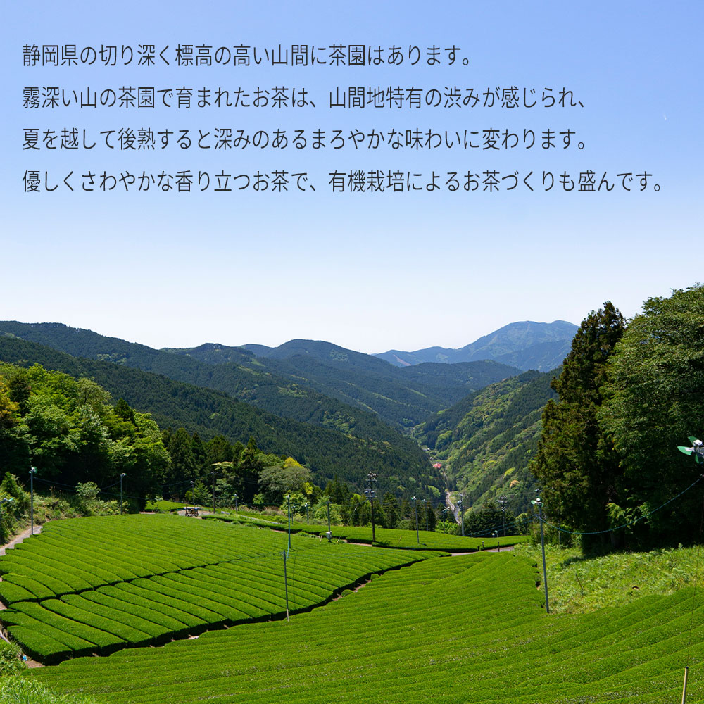 標高300〜500mの澄んだ空気と豊かな自然に恵まれた山間の冷涼で虫がつきにくい茶園で丁寧に育てられた茶葉を、独自のブレンドと製法で仕上げた一品です。