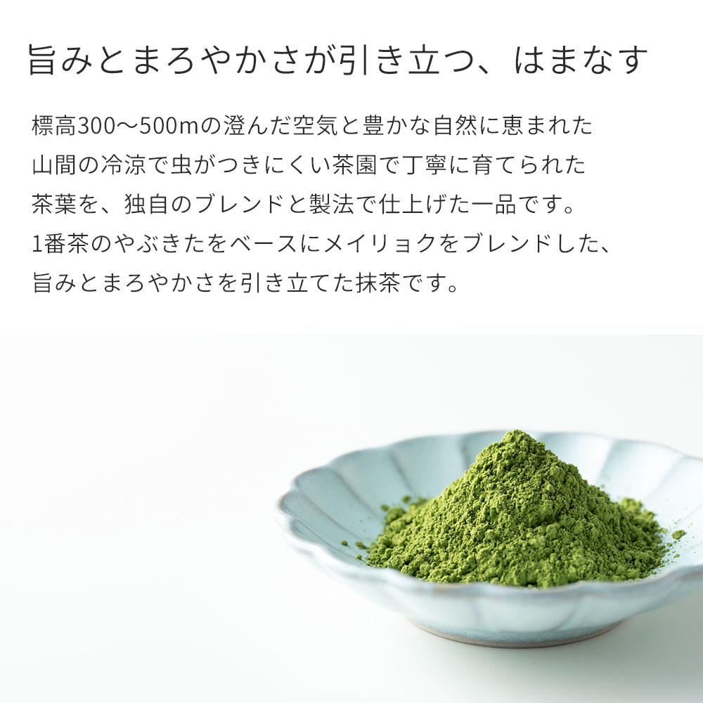 1番茶のやぶきたをベースにメイリョクをブレンドした、旨みとまろやかさを引き立てた抹茶です。